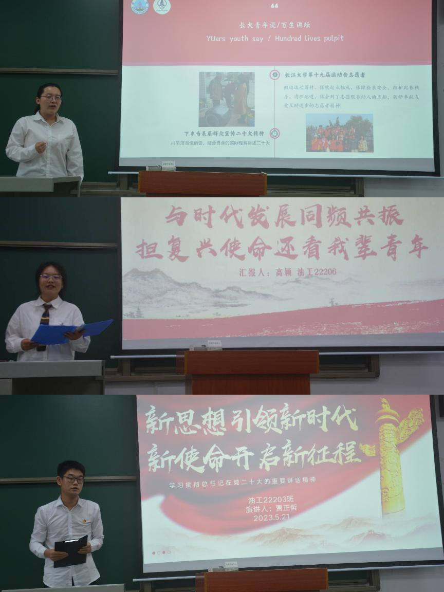 本次活动以“理论学习我来讲——学习二十大 永远跟党走 奋进新征程”为主题,活动分为主题讲演和“一点通”展示两大环节,通过挖掘身边模范主讲人,用自身成长经历讲好对党的认识,进而增强吾辈青年思想认同、情感认同、实践认同。最终油工22201班李明昊同学和油工22205班顾小青同学获评优秀主讲人。