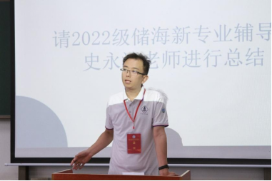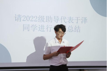 2022级员工辅导员史永波在总结中谈到,助导们为新生班级管理工作提供了有力的帮助,他对新一届的助导工作表达美好祝愿,希望新一届助导工作顺利,带领2023级新生争做“心中有爱,肩上有担,胸中有油,腹中有墨,目中有人,手中有艺”的六有新青年。