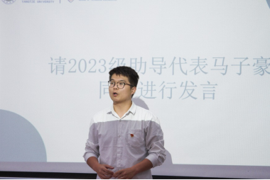 马子豪同学代表2023级助导作表态发言,他阐述了自己对助导的理解,要向上一届的优秀助导们学习,作为一个标杆去服务同学与老师,要敢于奉献自己,明确自身目标,竭尽全力做好自己的工作。
